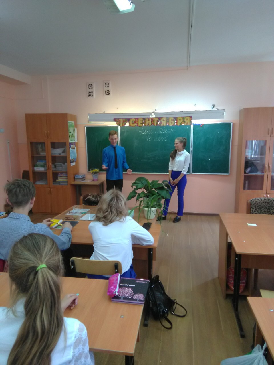 Не стала исключением и наша школа. В этот день во всех классах школы прошли уроки Победы. Это были разные по форме мероприятия (рассказы педагогов, презентации, исполнение песен военных лет, чтение стихотворений, викторины), в которых приняли участие 207 обучающихся, а также родители, которые присутствовали на уроках. Обучающиеся смогли ответить на вопрос: почему мы храним память о событиях 75-летней давности и передаем ее из поколения в поколение, какой ценой досталась свободная и беззаботная жизнь нынешних поколений.